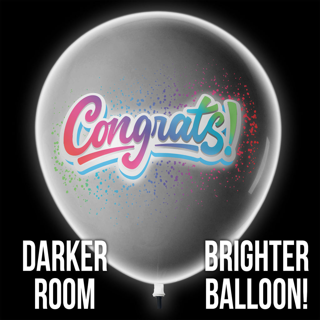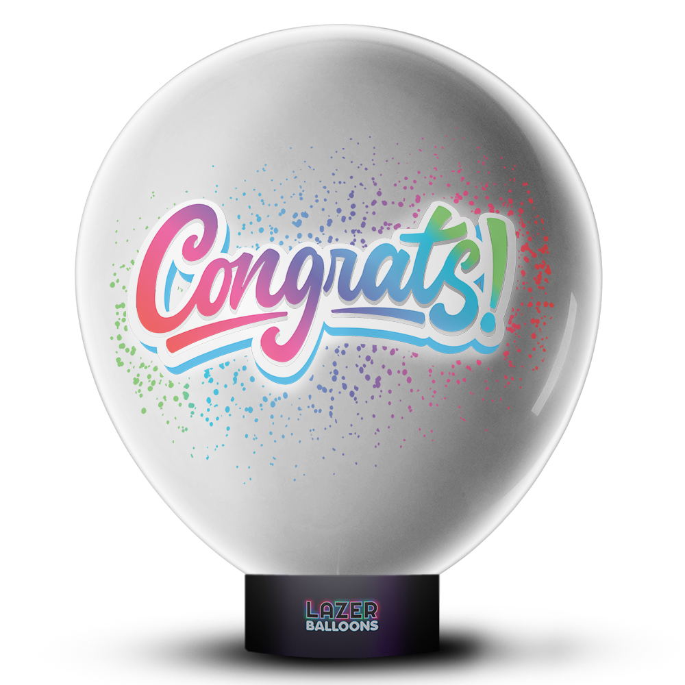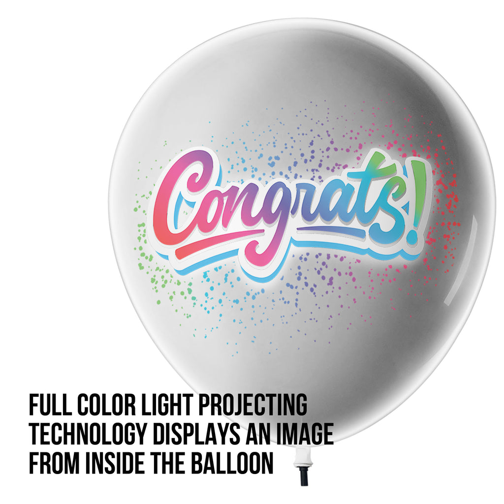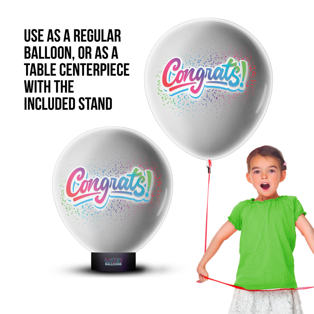 Light up the dark with Lazer Balloons! Lazer Balloons look like a normal balloon until you turn off the lights to see an amazing projected full color design. Our projection technology sits inside the giant, 18” latex balloon, creating an image from the inside. Each Lazer Balloon can be filled with air or helium, lights up continuously for 9+ hours, and includes a display stand. This balloon looks awesome with the lights off! The Congrats Lazer Balloon can be used for any occasion like a graduation party, retirement party, or any way you need to congratulate someone!