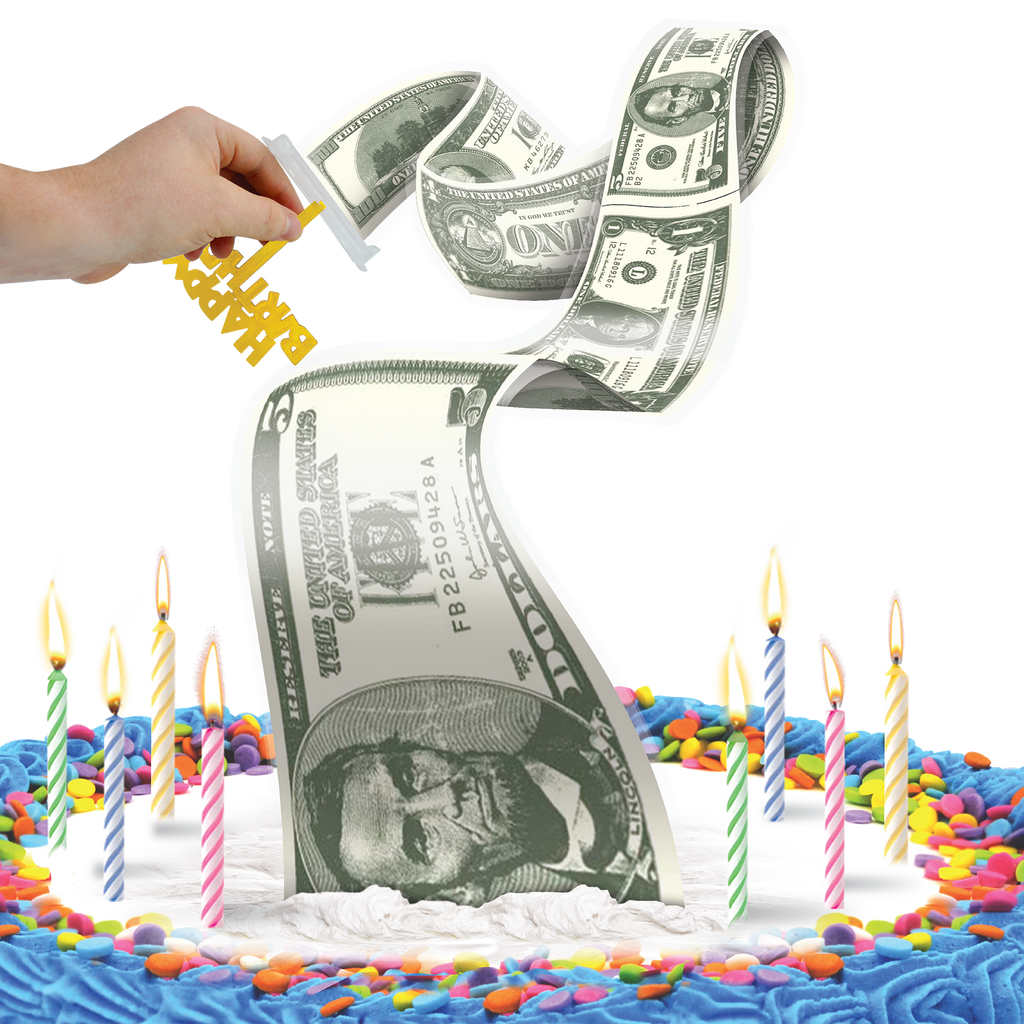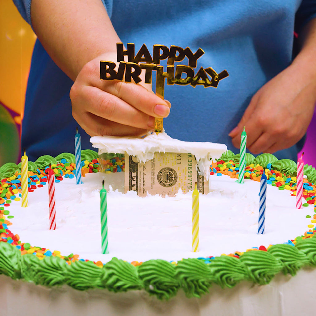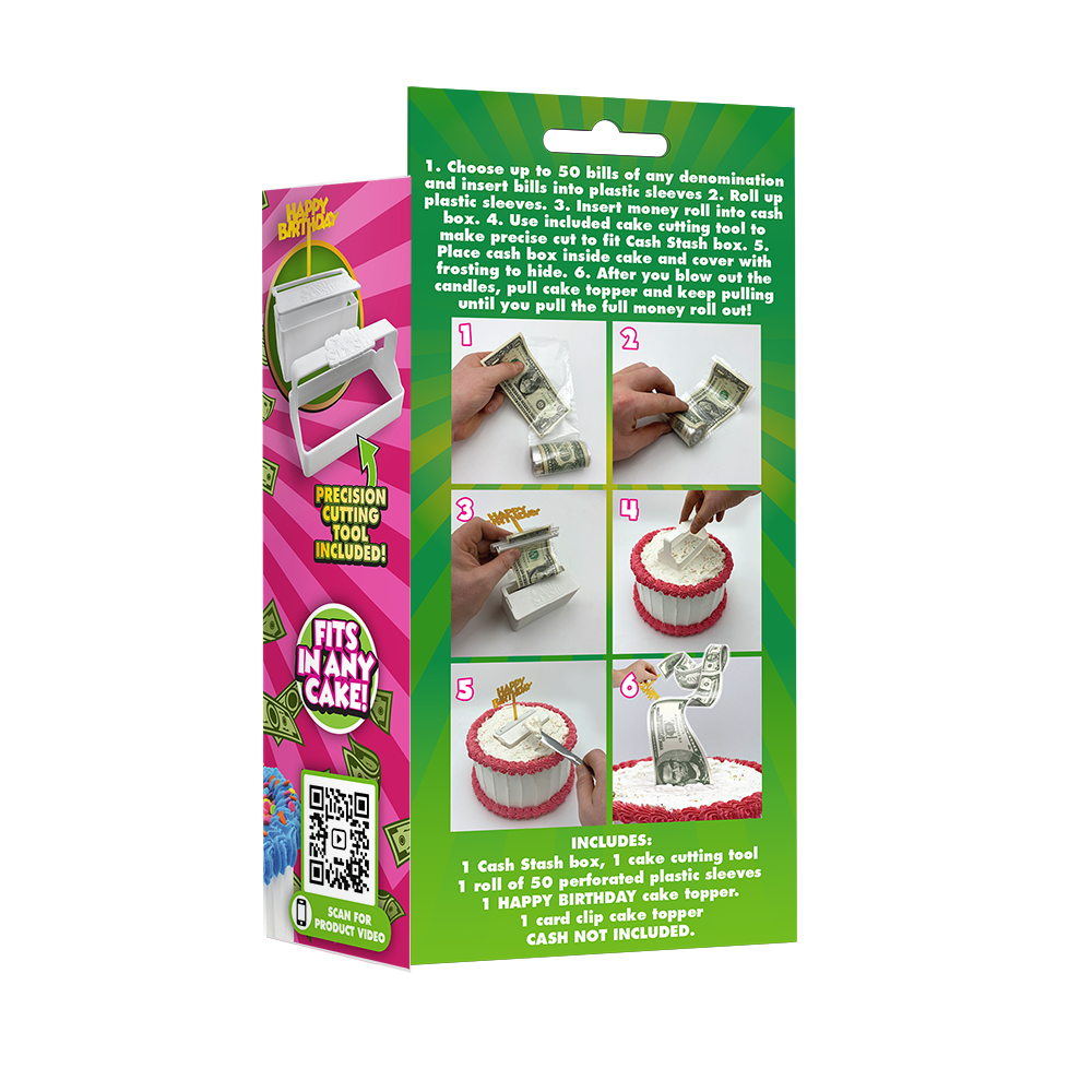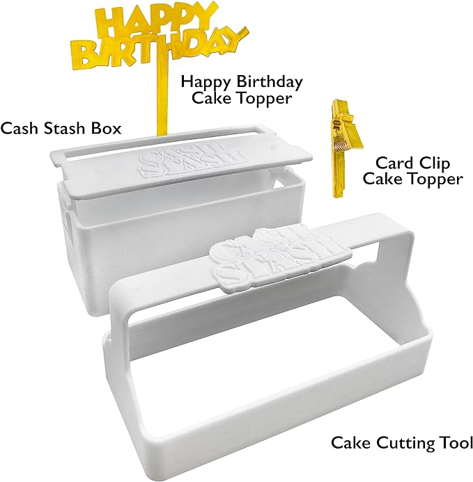 Everyone loves receiving cash! Now you can create an amazing surprise money cake with Cash Stash Cake Surprise. Hide up to 50 bills in the food safe plastic sleeves, then hide them inside your cake. Your guests will think it’s just an ordinary cake topper, but when you pull, the money is revealed! Includes a Happy Birthday Cake Topper and a card clip for any celebration. DIY methods are messy and complicated, but with Cash Stash Cake Surprise’s food safe plastic and included cake cutting tool, your cake and money stay clean. (Cash not included.)