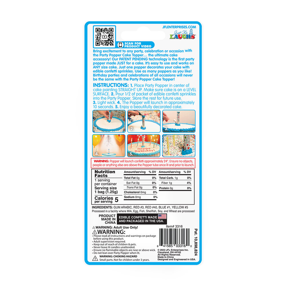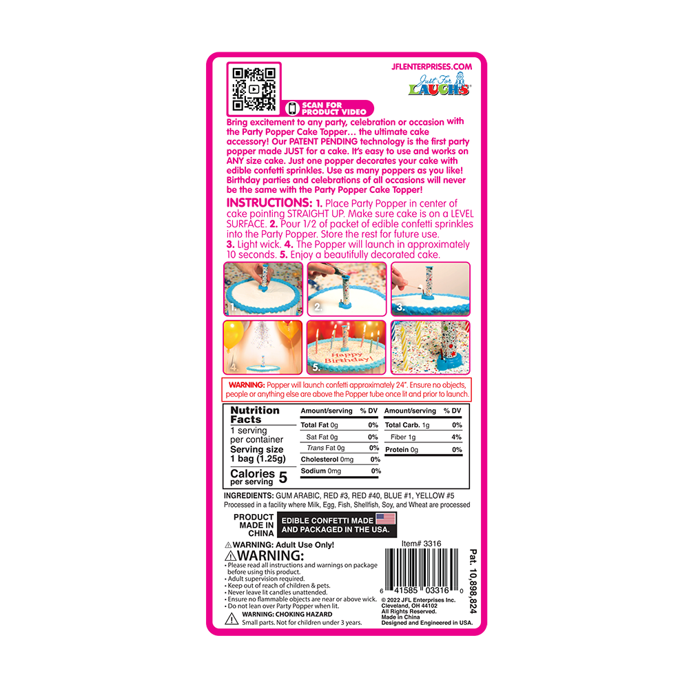 A confetti candle made for cakes! Light the center wick and watch as edible confetti sprinkles are shot into the sky, landing to decorate your cake. Each pack contains 2 Party Popper! Cake Toppers and a packet of edible confetti sprinkles that are made in the USA. One Party Popper! Cake Topper can decorate an entire cake.