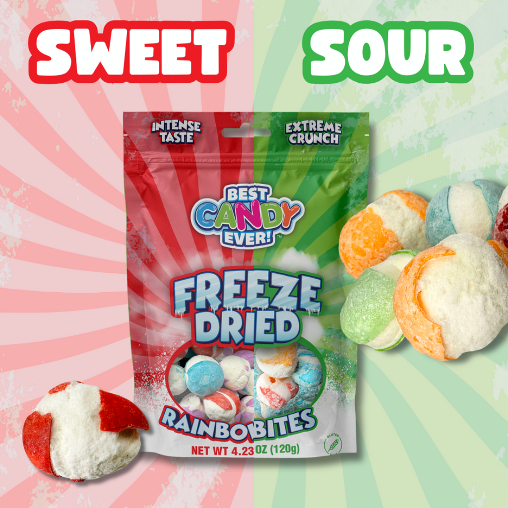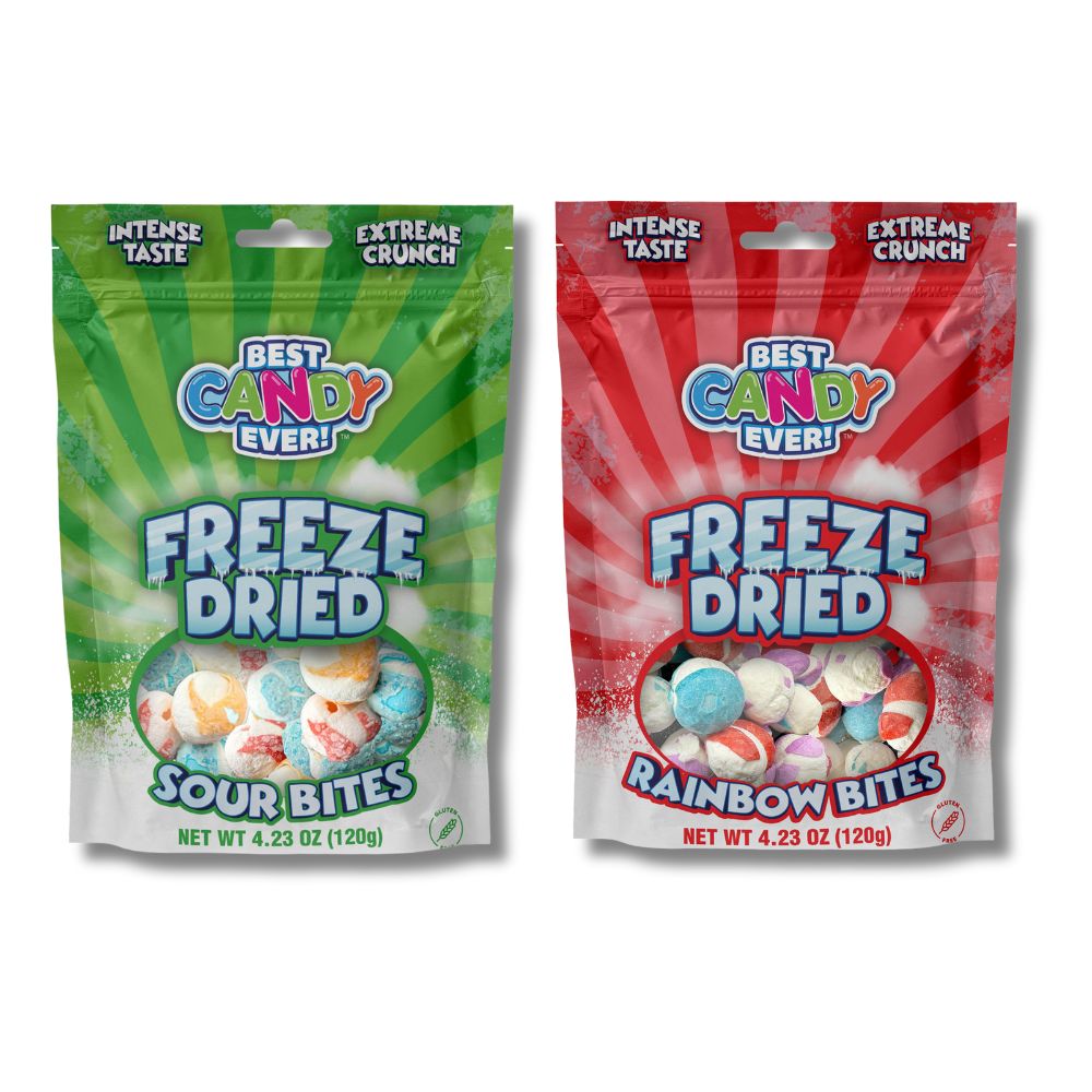 Get two bags of Freeze Dried Candy in one bundle! One bag of Rainbow Bites, and one bag of Sour Bites! These freeze dried candies are extremely crunchy, with intense flavor. This candy was once a chewy tangy candy with a crunchy exterior, but once freeze dried they expand and become crunchy! Freeze dried candy is a viral sensation that got popular on apps like Tiktok.