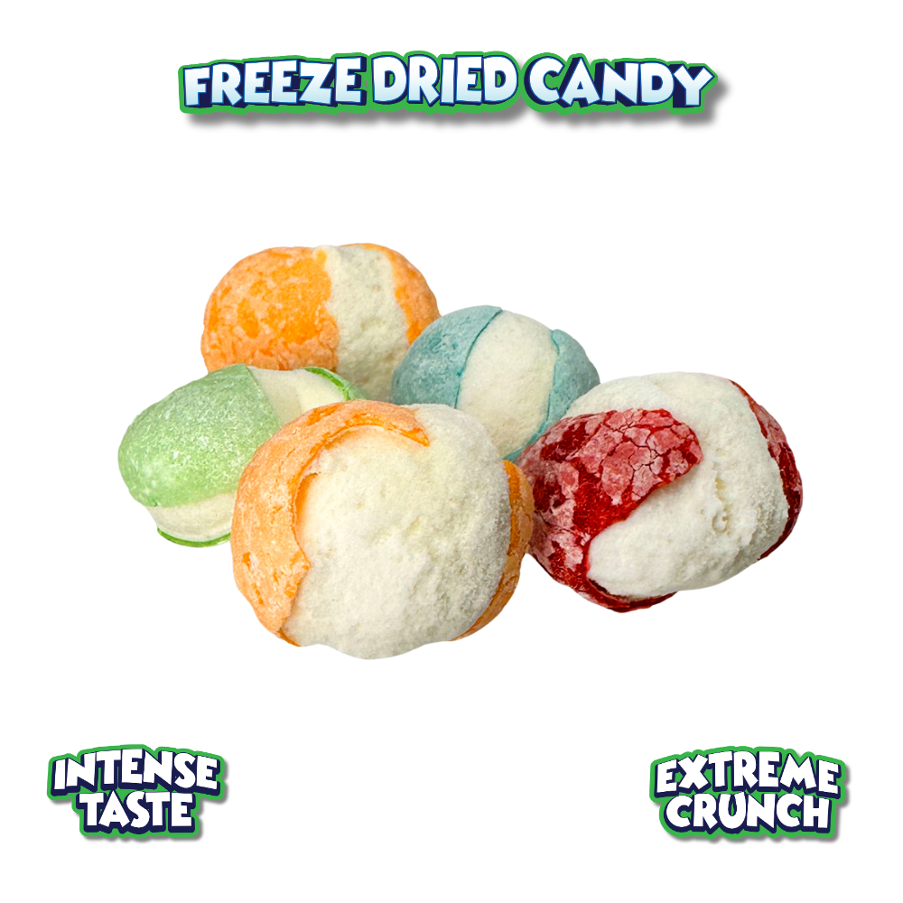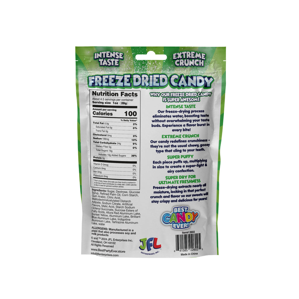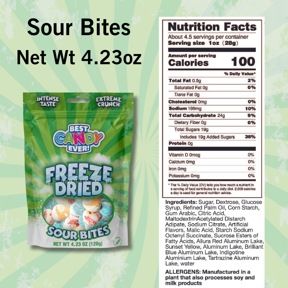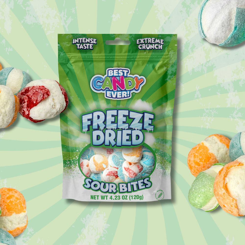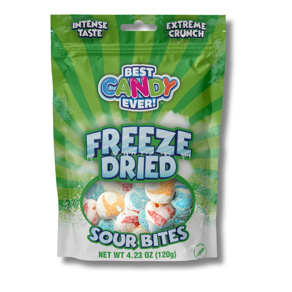 Experience the amazing taste and texture of freeze dried candy, with a sour twist! Our candy’s concentrated flavor and airy, crunch texture melts in your mouth for the perfect sweet treat. The freeze drying process eliminates water, puffing up each piece of your favorite candy into a fluffy, crunchy, and super light confection. The Sour Bites take a candy favorite to the next level with a sharp and tangy taste.