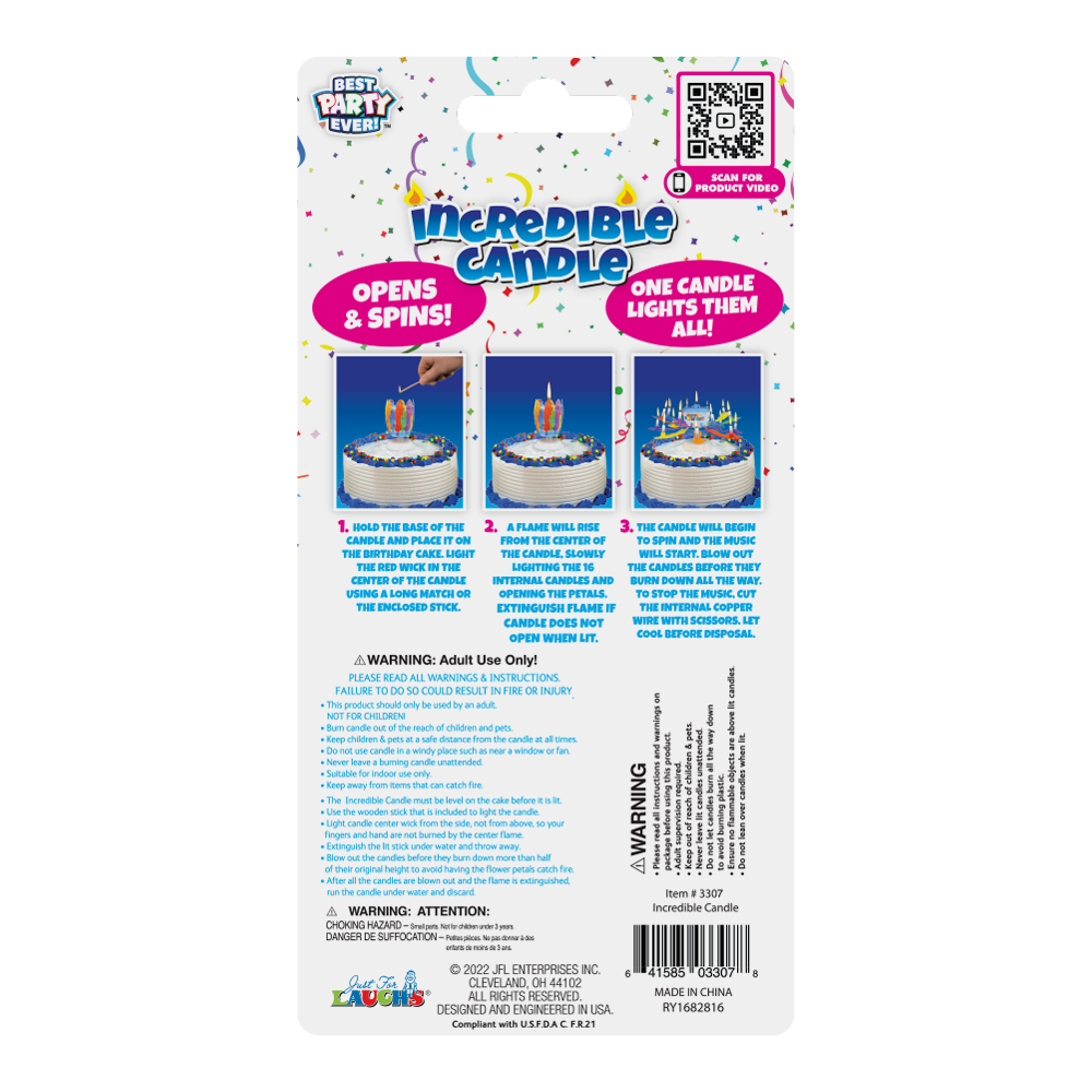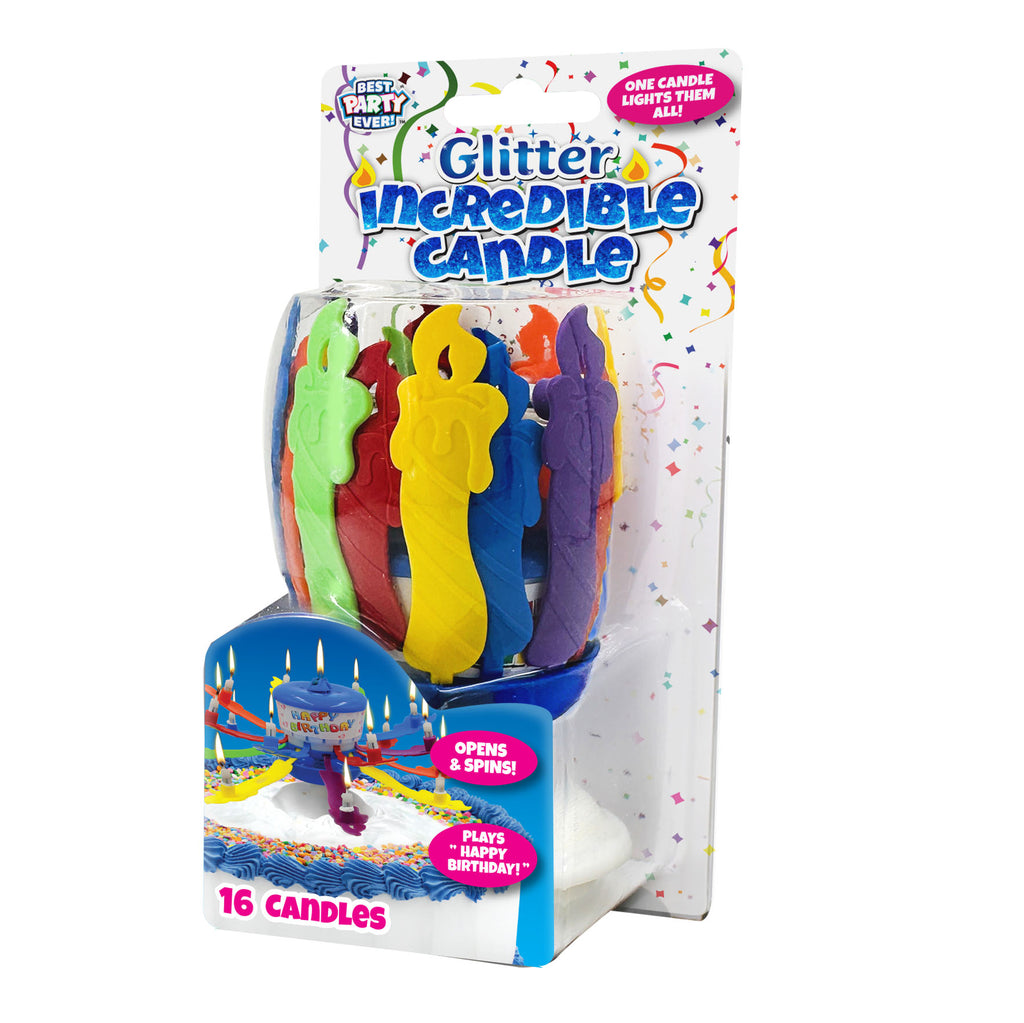 Celebrate your next birthday with the world’s most iconic candle - Incredible Candle! Light the center wick and watch the birthday themed petals open, lighting 14 individual candles. The Rainbow Incredible Candle opens, spins and plays Happy Birthday. No dripping wax or mess to clean up, Incredible Candle catches it all. It’s the perfect centerpiece for any birthday celebration.