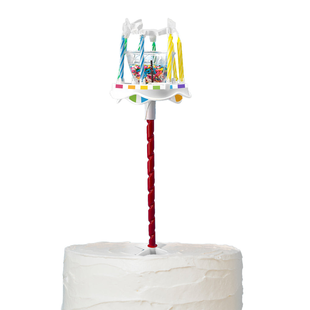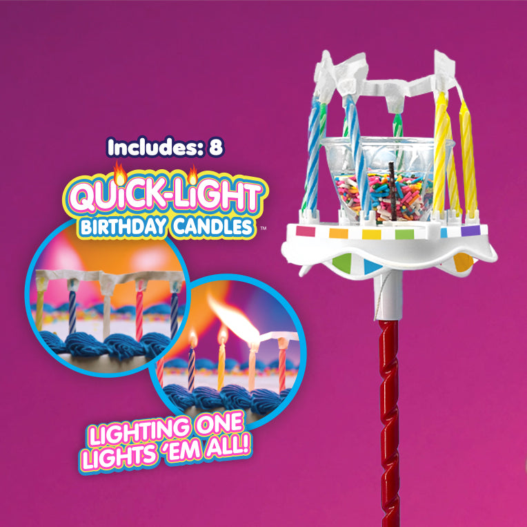 Decorate a cake in the most magical way! The Sprinkle Fountain Birthday Candle releases a waterfall of colorful sprinkles as it spins and decorates your cake instantly. Using special Quick-Light candles to create a chain reaction, simply light the wick and watch the show. It’s raining sprinkles! You can even reuse Sprinkle Fountain with your own candles and sprinkles. It’s the perfect sweet addition to your next celebration.