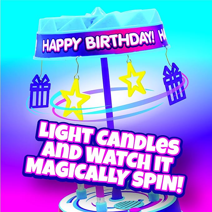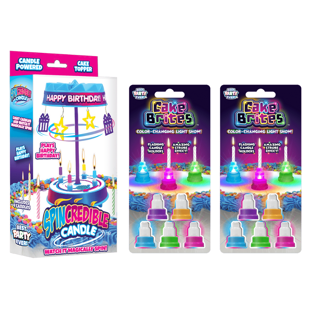 This bundle includes 2 packs of Cake Brites, and one Spincredible Candle. The Cake Brites make a light show on any cake. Just turn them on and place a classic candle in the holder. Cake Brites create a magical and colorful light show! Also in this bundle you receive a Spincredible Candle. The Spincredible Candle spins and plays the tune of Happy Birthday. As it spins the charms fan out creating a fun carousel effect as the charms spin around!