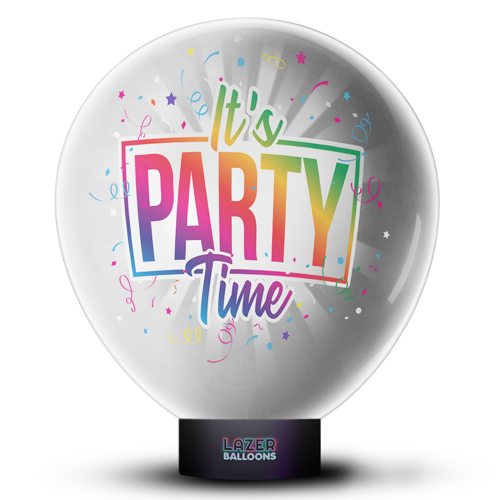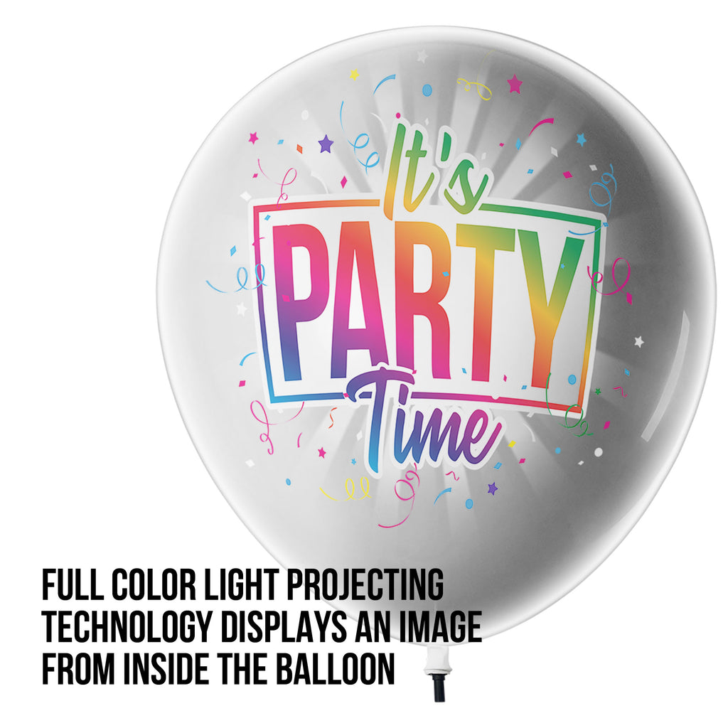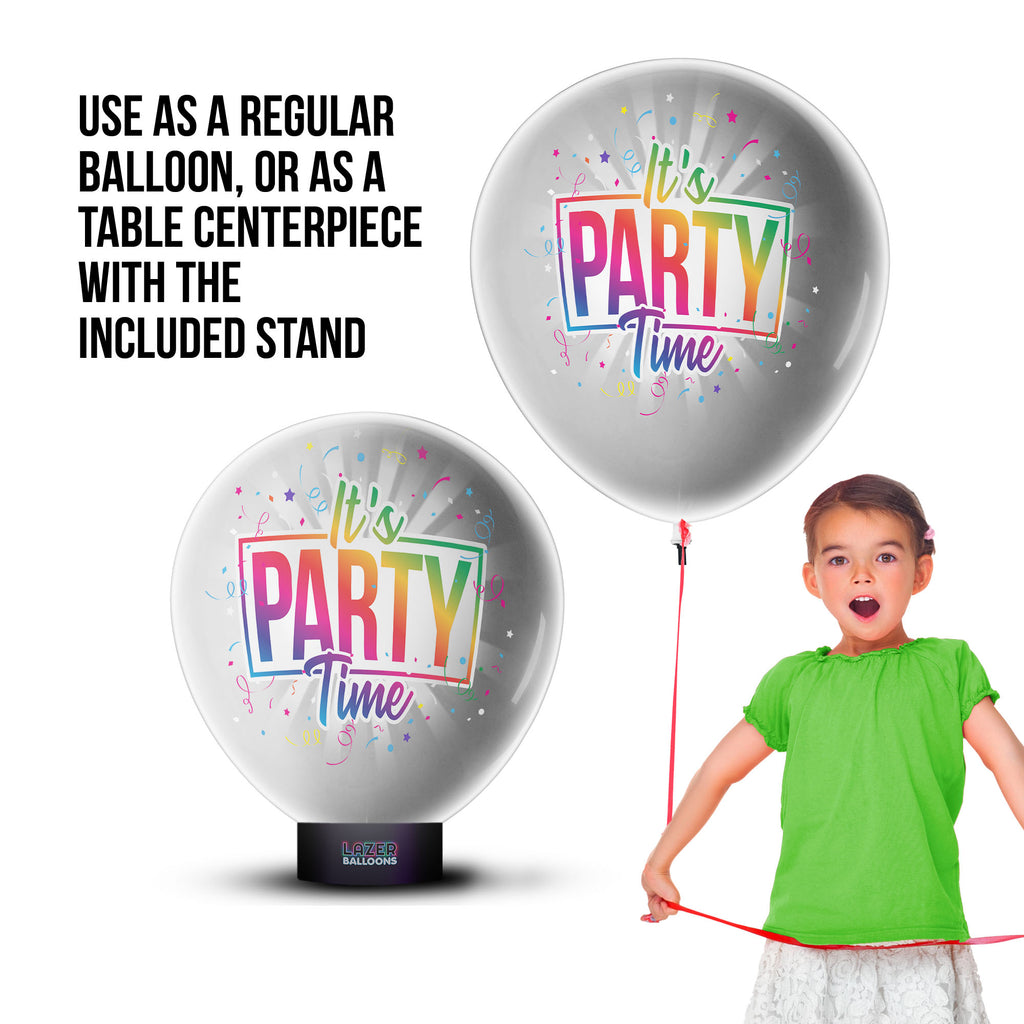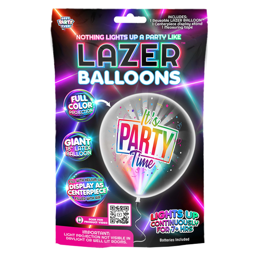NEW Lazer Balloons are the perfect balloon for any celebration in the dark. Lazer Balloons use light projection technology to display a full color image on the giant 18” latex balloon for over 9 hours. Fill the balloon with air or helium and display it on the included display stand. This balloon is the perfect way to light up a party! This product is designed for use in dark spaces.