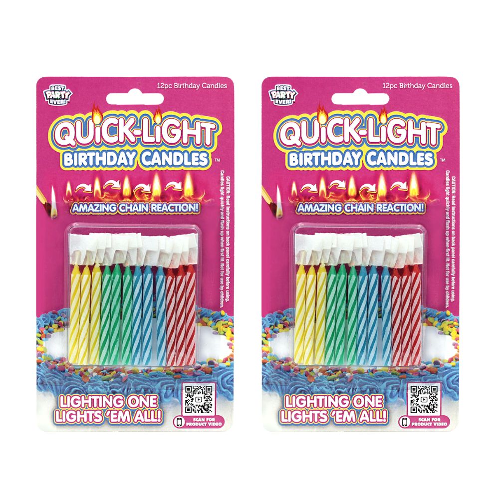 The Quick-Light Birthday Candles use innovative Quick-Light technology that initiates a chain reaction where lighting one candle lights them all! Double the fun and connect the Quick-Light Birthday Candles to create an even longer strand of candles. 24 candles included. These Quick-Light candles are connected in a colorful chain of yellow, green, blue, and red birthday candles.