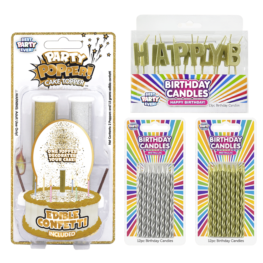Celebrate in style with metallic gold and silver decorations! This bundle includes one pack of Party Popper! Cake Topper Gold and Silver, one pack of Metallic Silver Birthday Candles, one pack of Metallic Gold Birthday Candles, and one pack of Gold Metallic Happy Birthday Letter Candles! The Gold and Silver Party Popper! Cake Topper shoots edible confetti to decorate your cake.
