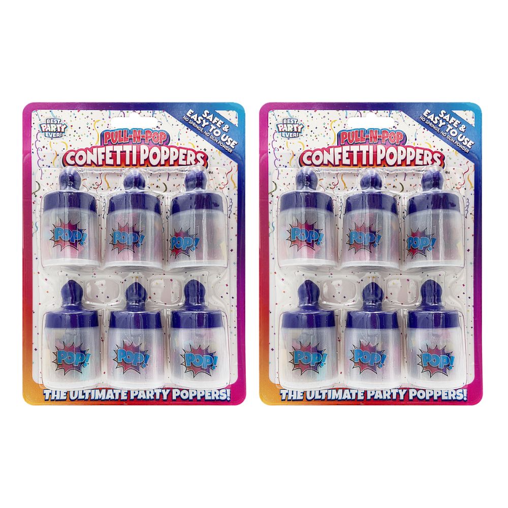 Add a fun and safe POP of confetti to any party with Pull-N-Pop Confetti Poppers! Pull back the rubber handle and release to shower colorful, recycled confetti into the air. Traditional party poppers use gunpowder, but Pull-N-Pop Confetti Poppers use only air for a clean and safe celebration. Perfect for New Year’s Eve, Graduation, Surprise Parties, and any special occasion! Receive 2 packages in this bundle, with 12 total confetti poppers.
