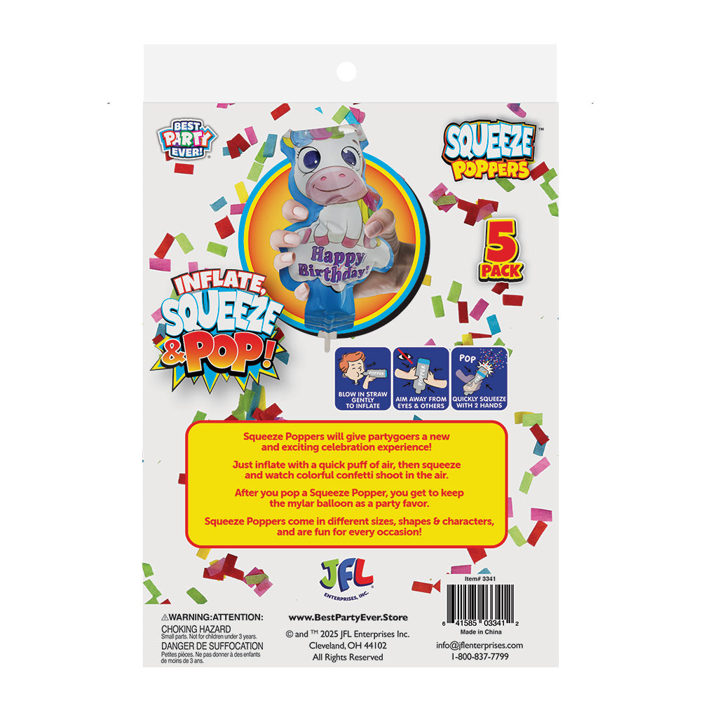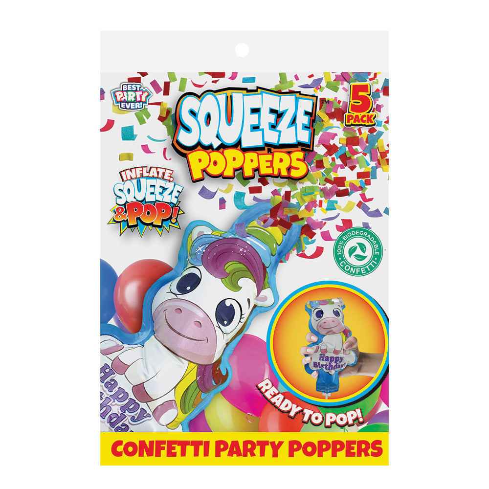 Bring the party to life with Squeeze Poppers – the ultimate twist on classic confetti poppers! These fun, handheld balloon poppers are easy to use and perfect for any celebration. Simply inflate the handheld balloon, give it a good squeeze, and watch as vibrant, rainbow-colored confetti bursts into the air! Squeeze Poppers are the newest innovation in party supplies, combining the excitement of balloons with the surprise of confetti. Ideal for birthdays, graduations, baby showers, weddings, and more, they add a colorful pop of joy to any event. Make your next celebration explode with fun!