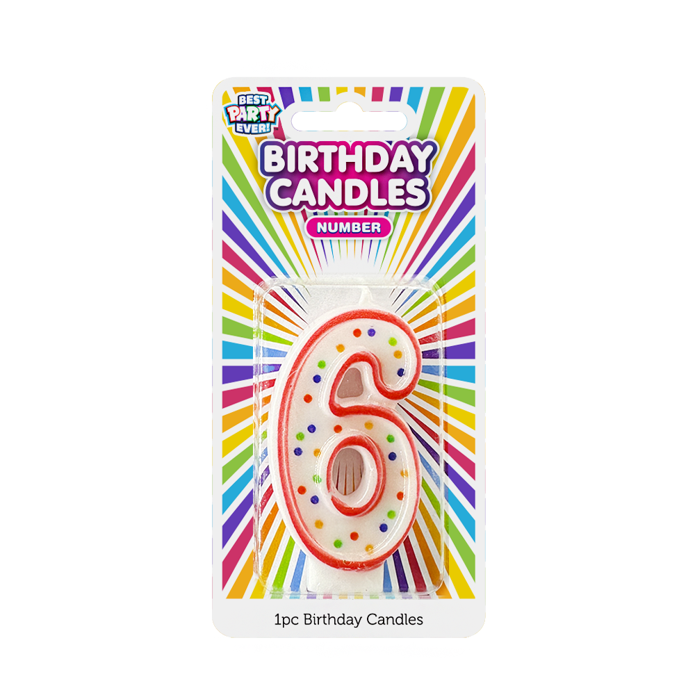 A classic look number candle to help personalize any cake. This numbered birthday candle is the perfect way to celebrate accordingly with our familiar and timeless design! Personalize any cake with the number six birthday candle.